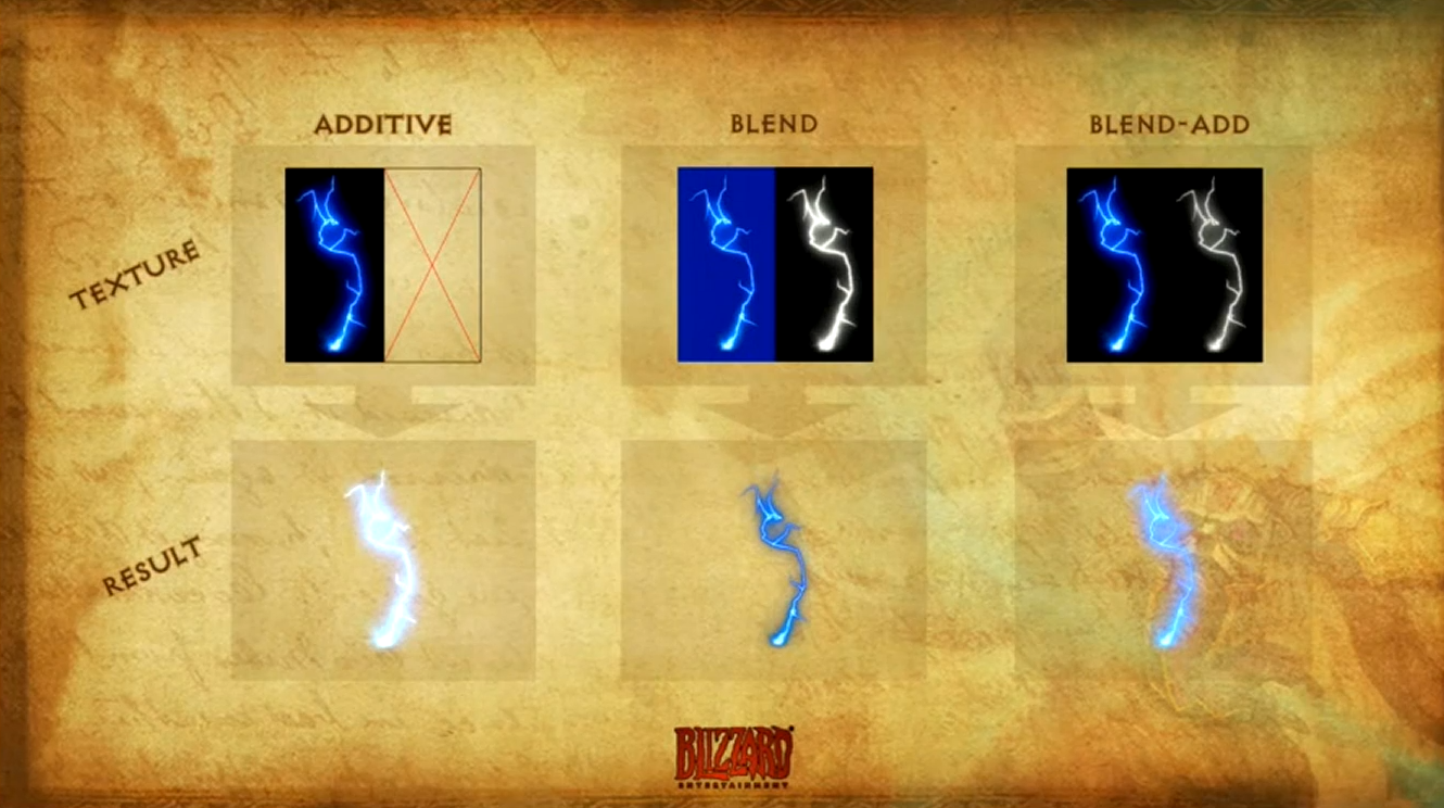Fig. 11 - A slide from the GDC talk showing the differences between additive, blend (Translucent in UE I believe), and blend-add (Alpha Composite).