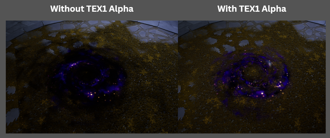 Fig. 16 - With and without TEX1 alpha being used in the materials final shader.