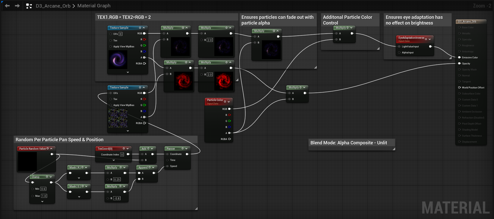 If you want to read up more on Alpha Composite in UE or Unity, I would recommend reading this article by Martin Ellis. The gist is that when all the spells in Diablo are going off, if you used additive blending for your VFX, everything would eventually become one large mass of white due the vast amount of spells on screen. Using Blend (Translucent) doesn’t really allow you to make something pop as strongly emissive as additive. Blend-Add (Alpha Composite) essentially places a black background behind the emissive part that you want to render, helping it stand out more in a scene with a lot of things happening at once.