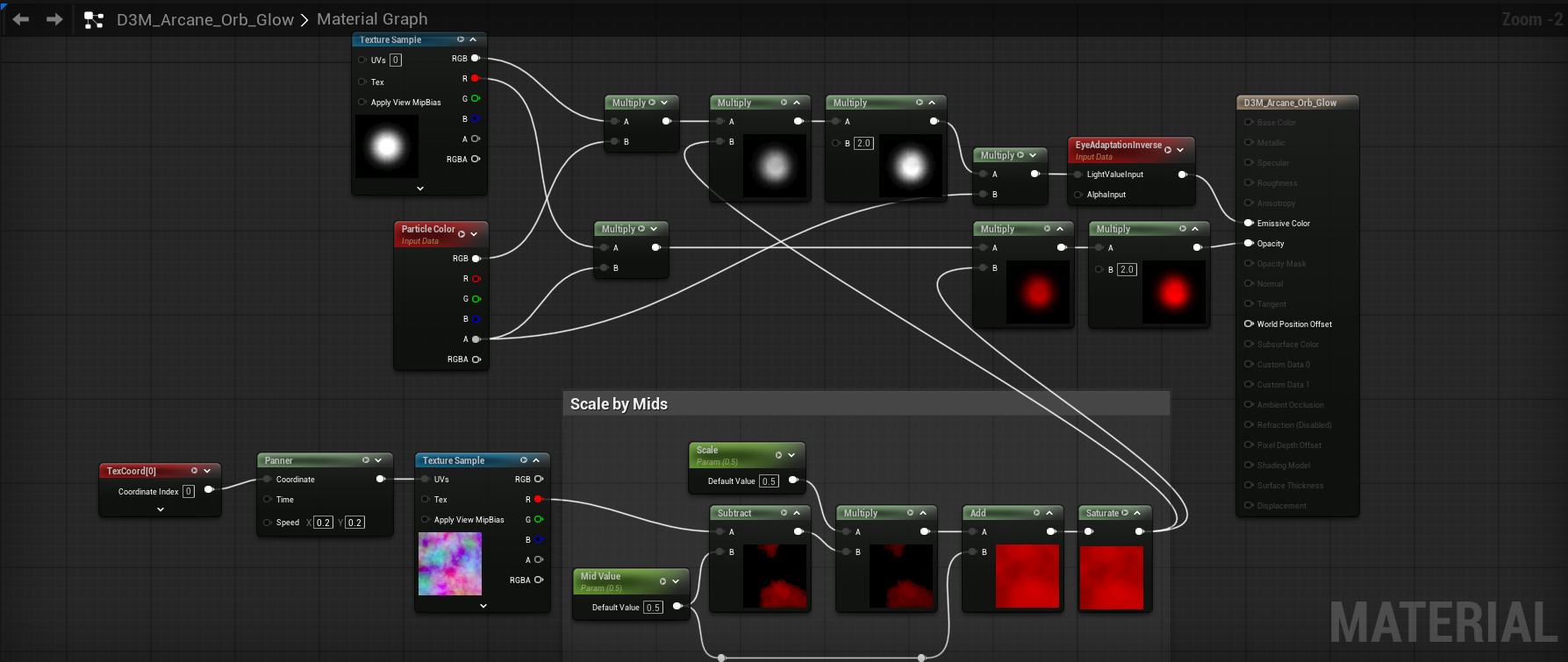I had a brief conversation with Julian when troubleshooting my own D3 inspired implementation and in many cases to ensure that the desired motion was achieved, he mentioned that you need a function that can scale mid ranged colors to either additive or subtractive effect. We’ll touch more on this in a bit, but I built a function which scales the range of a grayscale texture from middle gray to allow you to tweak the coverage area and value differences of your motion. In my conversation with Julian he had this to say; “The more you multiply, the more you want to constrain the range of your noise. I built a function called Scale by Mids, which scales the range of a grayscale texture from middle gray. Once you have a lot of black in your texture, it eats up a lot of action.”