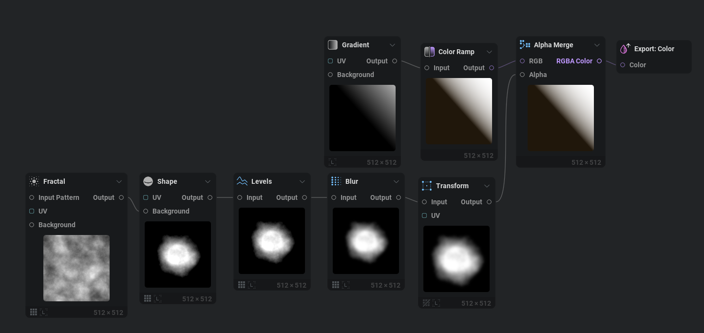 Finally, in Fig. 14 we create an alpha channel and merge it in with Alpha Merge. You’ll notice that our alpha channel has a smokey/fiery noise baked over the spiral shape. I did this because with Alpha Composite you get to dictate where both color and black can appear and in the reference the spiral seems to have a hazy smoke effect outside of the spirals range of influence.