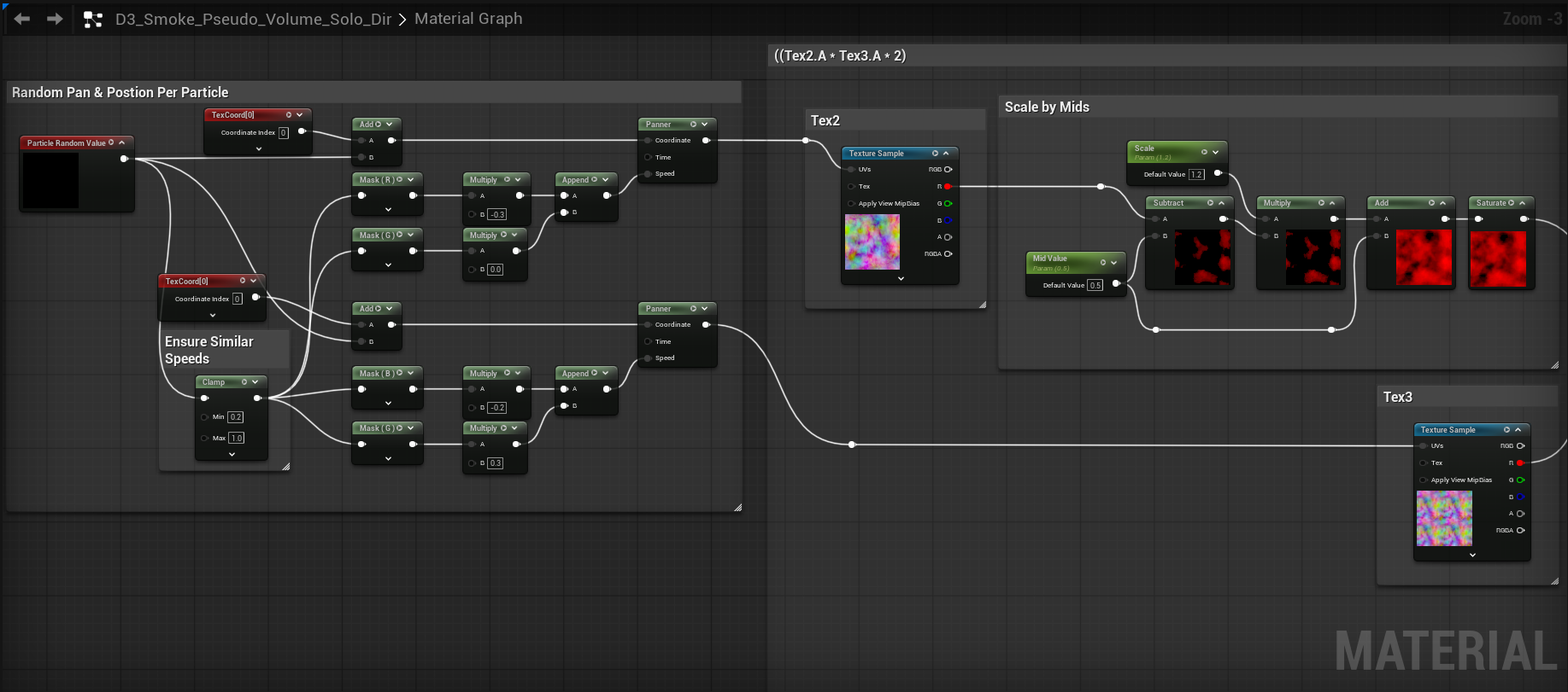I discovered that when setting panner speeds you want to clamp your values to something greater than zero and a max of 1. Without it, you can have some particle instances scrolling too slow and the effect of seamless cohesive motion can be broken. The texture coordinates from top to bottom go from 0.5, 1.0, and 2.0 in terms of UV scale. Moving over to ((Tex1.A * Tex2.A * 2) * Tex3.A * 2) should be self explanatory as we are simply multiplying the textures together to blend their motion. The final multiply in our graph in Fig. 5 plugs in to the A pin of the subtract node in our Scale by Mids function.