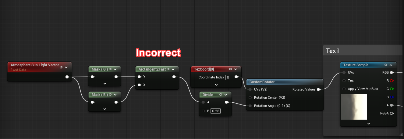 I’m going to revert back to our unlit mode D3 gradient based shader used in Fig. 31, but I’m going to add in a few nodes that orient the gradient towards the sun. I will add a disclaimer for what's to come: the method I use is crude and not perfect, I’m not a tech artist by trade so have limited knowledge on how to fix some of the issues ahead correctly. Luckily, Deathrey from the RTVFX discord server helped me find the correct solution in Fig. 33 to properly orient our texture towards the sun no matter where our camera was. I would encourage you to try both the incorrect and correct methods for texture orientation to see how they affect your particle lighting from different camera angles. In Fig. 34 we use an arrow texture to ensure this new function will orient our texture towards the sun.