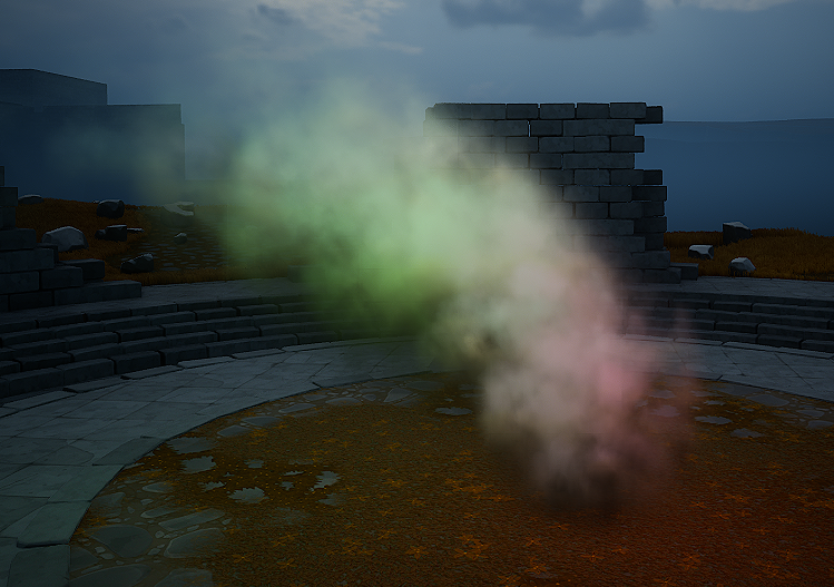 Next I wanted to see how point lights work in an environment without a sun in Fig. 41. If the point lights are too bright, you will have issues with colors being blown out still unfortunately. However this may just be due to other post process settings in our scene and is isolated to our level. In our final smoke I do end up testing it in a different level and did not have the same issues.