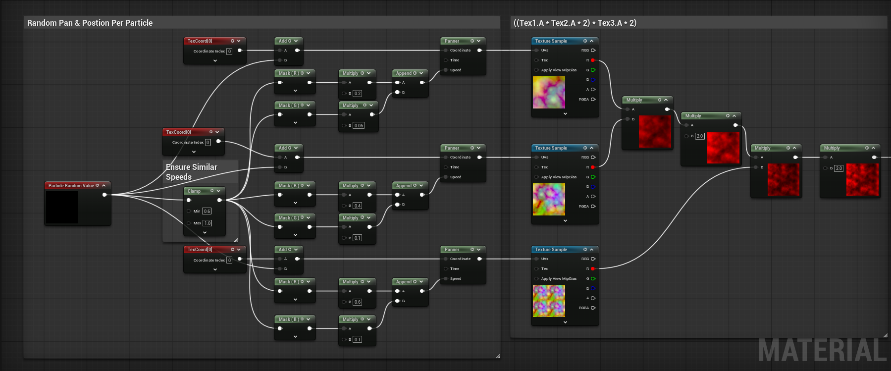Improper scroll speeds as seen on the left can break the illusion of a texture that is morphing over time and can cause it to look like what it really is, two textures scrolling past each other. On the right we have similar scroll speeds which allows us to capture the morphing look we’re going for. When you have two particle sprites over each other, if their randomized scroll speeds are too different, you can also have this issue occur. For this reason, we added the clamp node to our random particle value in our material to ensure a minimum scroll speed is maintained across all particles.